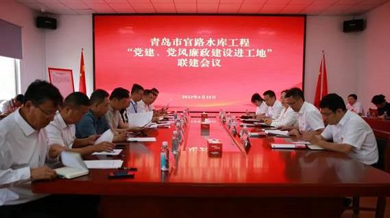 为护航青岛市官路水库重大工程建设,落实主题教育工作和《青岛市官路水库工程建设管理办法》关于党风廉政建设和“党建进工地”的部署要求,2023年6月25日下午,官路水库公司、围坝主体工程八家参建单位在项目现场指挥部驻地隆重举行党建、党风廉政建设进工地联建会议,城投集团党委委员、纪委书记冷严冰出席会议并作党风廉政建设集体谈话,官路水库公司和城市更新集团纪检负责人、城投集团纪委监察办有关同志参加。(图为会议现